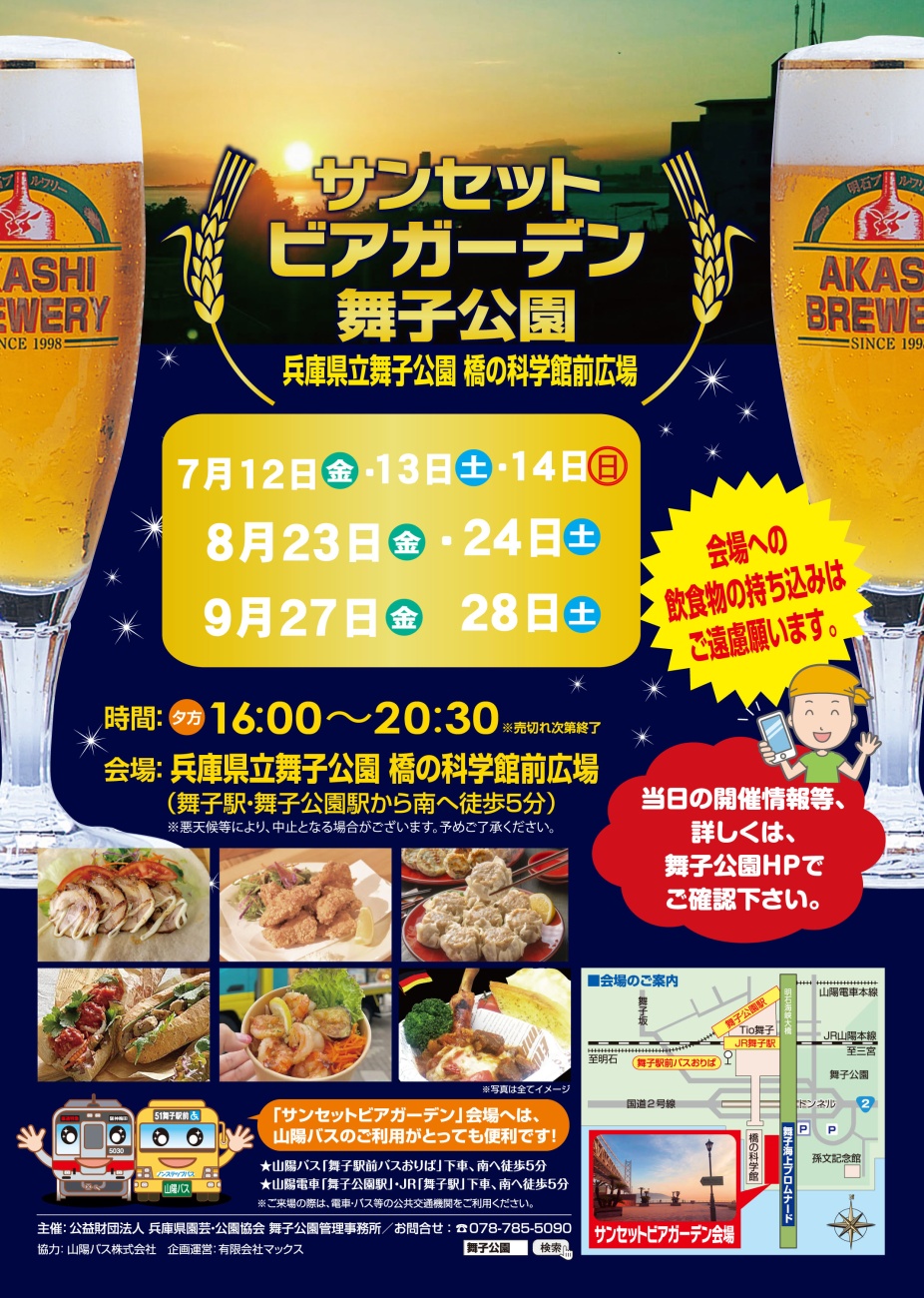 サンセットビアガーデン舞子公園では、夕日を眺めつつ地ビールなどがおたのしみいただけます。