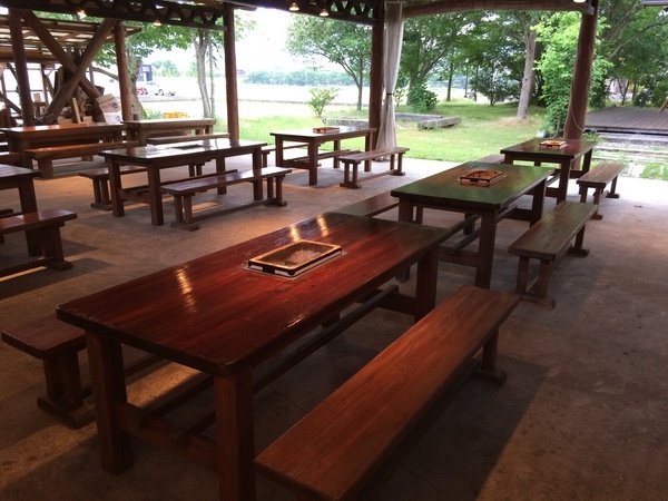 直営牧場で育てた「はなが牛」を、オーガニックで無添加の加工品や、熟成肉として売店やレストランでふるまっています。桜やさまざまな木々のある庭の前に設けてあるバーベキューコーナーにて、バーベキューを楽しむことができます。