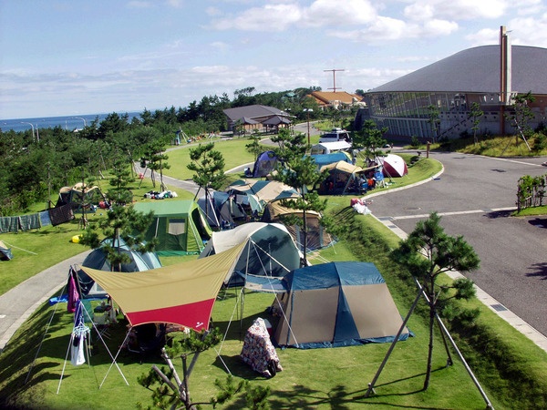 うみっこらんど七塚は、白尾海水浴場まで徒歩約5分の好立地。1区画10×10mのオートサイトはすべてAC電源(サイト使用料とは別途500円で貸し出し)と水道付き。バーベキューサイトは全6基。