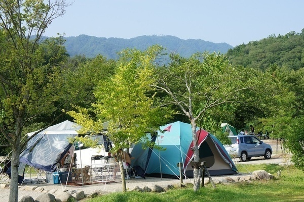 10m×10mに区画され、広場を囲んで作られているので、広々として開放的です。場内が平坦ですので、ファミリーやグループでもご利用しやすくなっております。テントサイトは土と砂と小さな豆砂利で水はけ良好です。 スチールのペグがおすすめです。川べりのサイトからは木津川や、鯛ヶ瀬渓谷が望めます