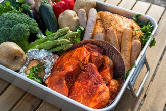 ヒュッターBBQは、お客様ご自身で焼いてお楽しみいただくセルフBBQ。特製スパイスに漬け込んだポーク/チキン、ソーセージ、季節のお野菜各種などの食材をご用意。本格バーベキュー用コンロや、炭・トング・火起こし道具などの機材も全てご用意いたします。後片付けも不要です。屋外BARでは地域のクラフトビールもお楽しみいただけます。