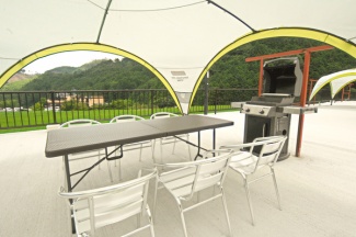 自然に囲まれた開放的な空間でアメリカンスタイルバーベキューを楽しめます。ブロック肉や骨つき肉をWEBER製バーベキューコンログリルによりむら無く、肉の内部まで加熱され美味しく焼きあがります。コールマン製パーティーシェードにより雨に濡れることなく、太陽光を適度に遮ってくれます。